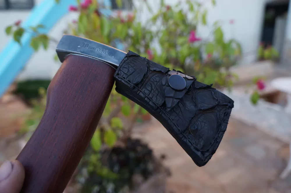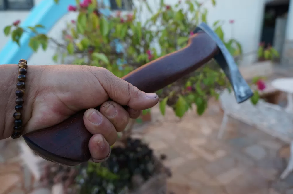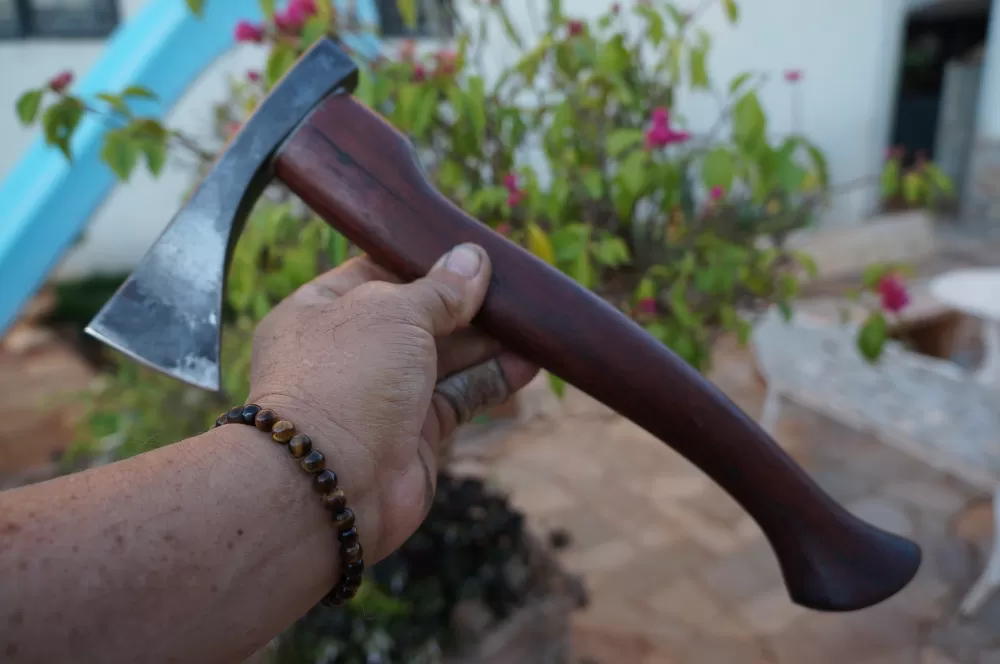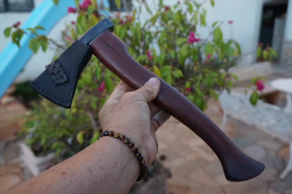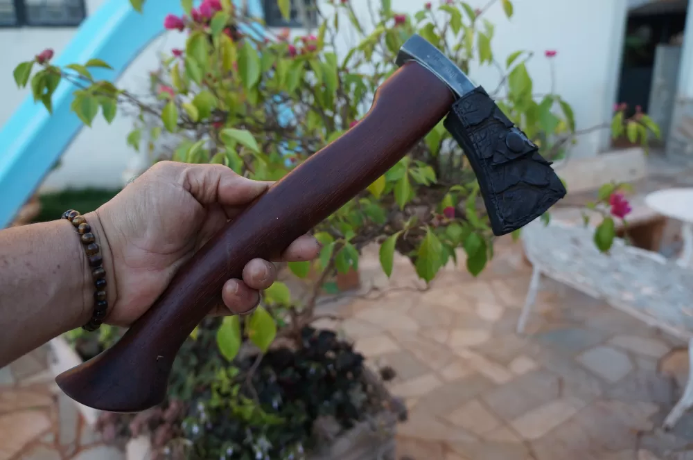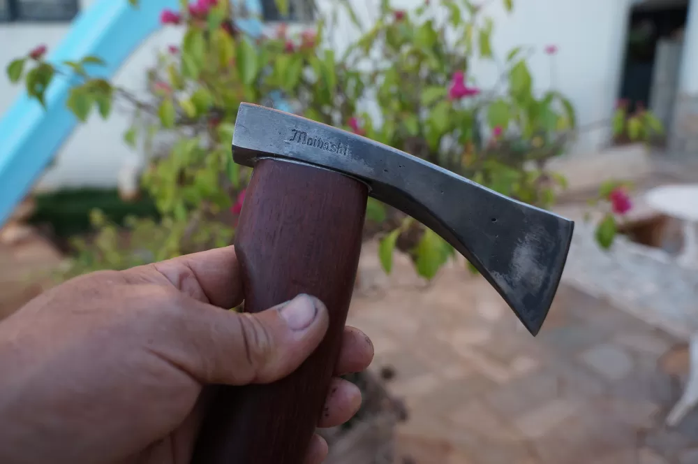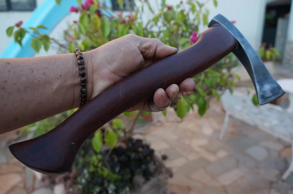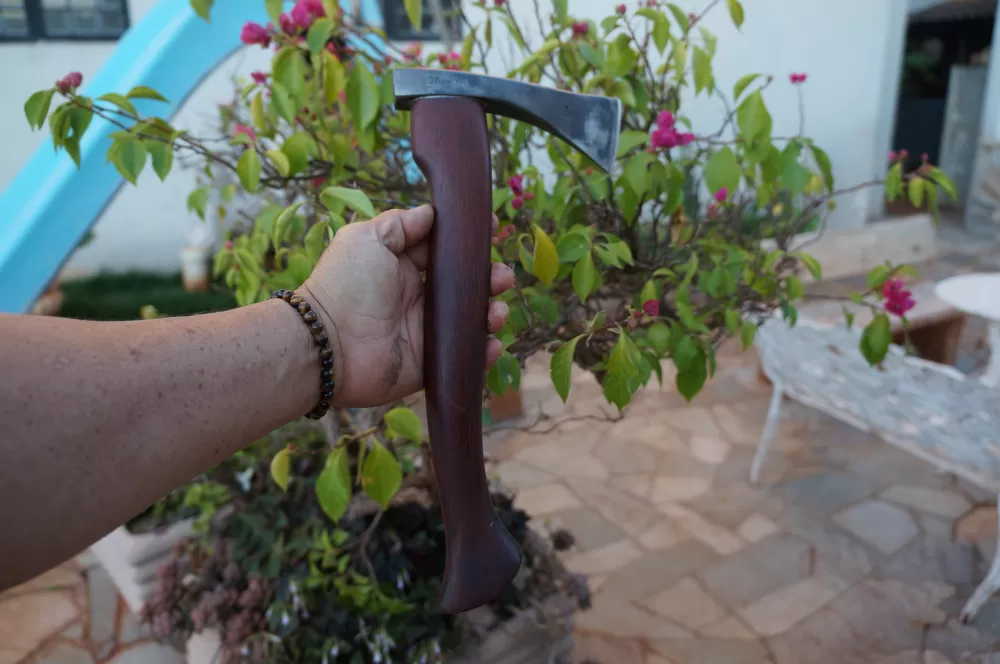 Machadinha Artesanal MaibashiKnives Knv 6977, cabo em madeira de lei, esculpido primorosamente, com ótima empunhadura.