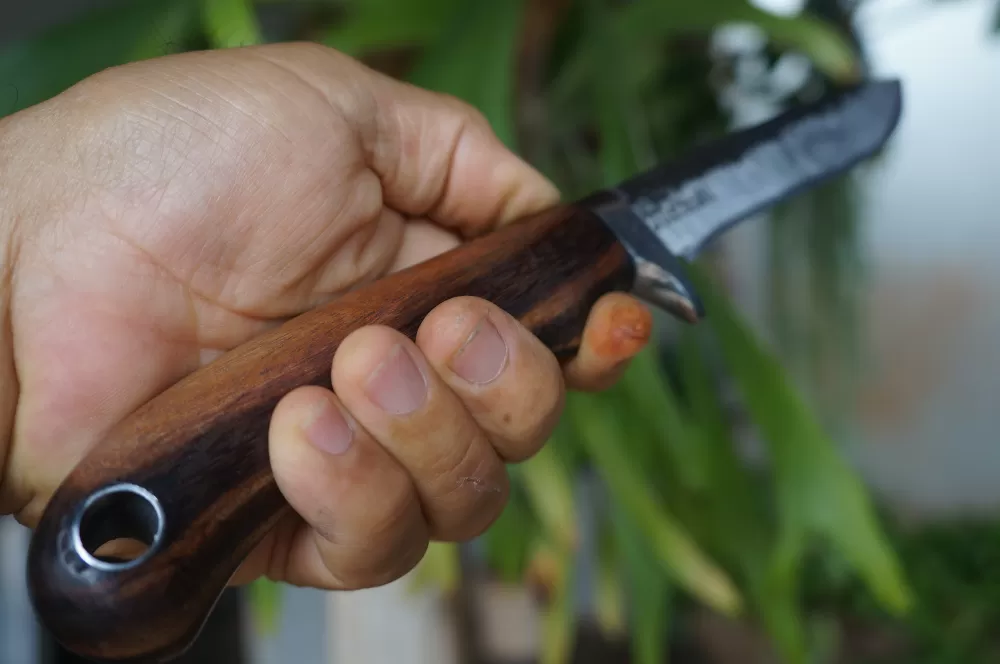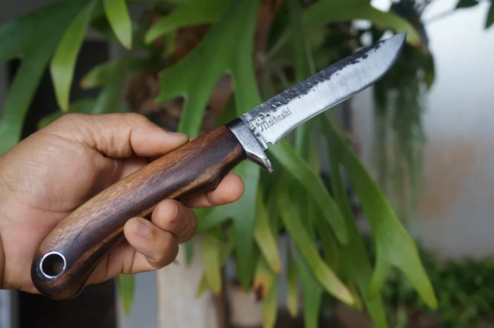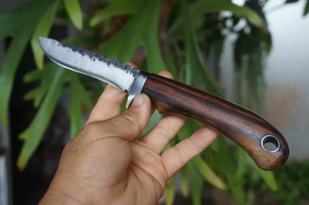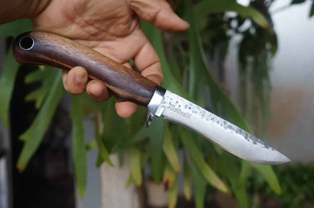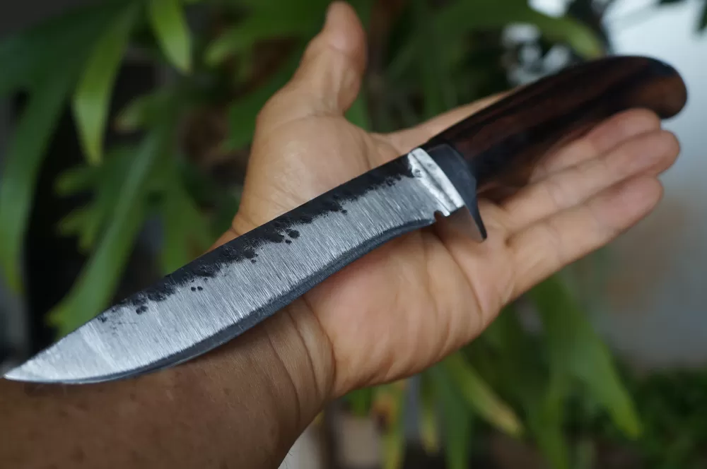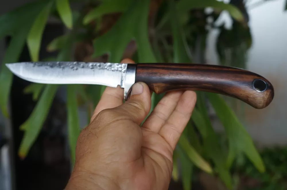 Confeccionado artesanalmente em aço Carbono 1095, construção tipo hidden tang, lindo cabo em Madeira Nobre ( Angico Lilas ).