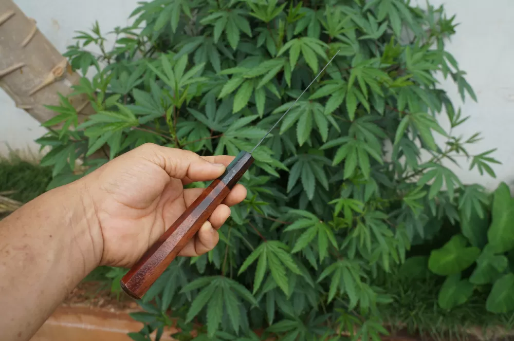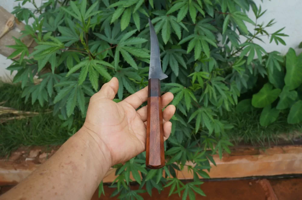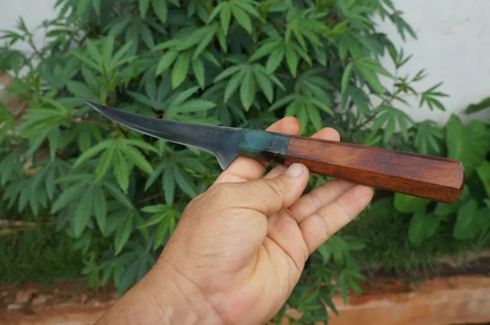 A lâmina da faca de filetar feita em Aço Carbono Reciclado ( Podão Canavieiro ), foi habilmente confeccionada para garantir a resistencia ideal, permitindo que ela se ajuste aos contornos do alimento com precisão rigorosa. Possui ponta afiada para facilitar a entrada na carne, enquanto o gume fino como navalha, desliza suavemente ao longo das fibras, resultando em filetes limpos e perfeitamente cortados.