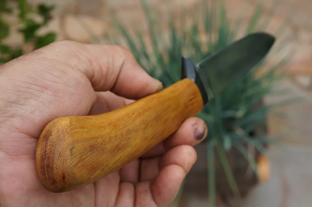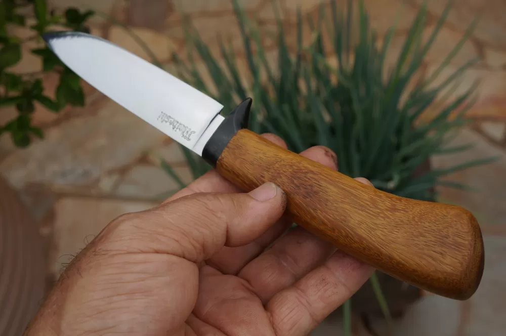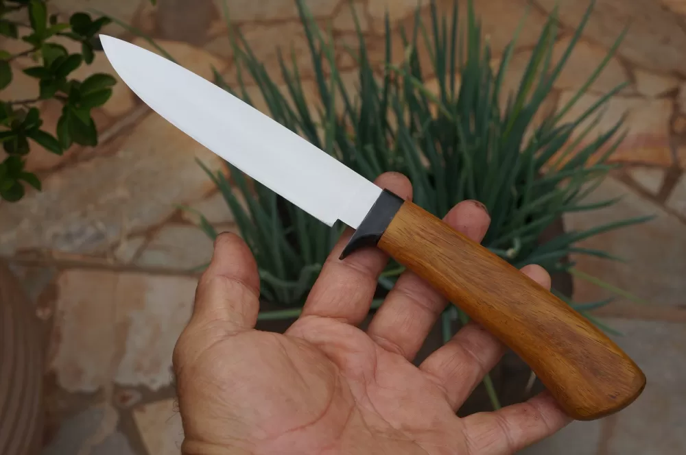 Confeccionado artesanalmente em aço Inox 420, construção tipo hidden tang, guarda simples em aço 5160, lindo cabo em madeira Marmeleiro.