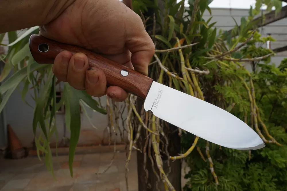 O cabo ergonomicamente projetado em uma bela madeira de Brauna, seu pino central em inox de grande calibre lhe confere rara beleza, confere ao cabo toda a robustez esperada, e ainda oferece uma aderência confortável e segura, permitindo um movimento sem esforço.