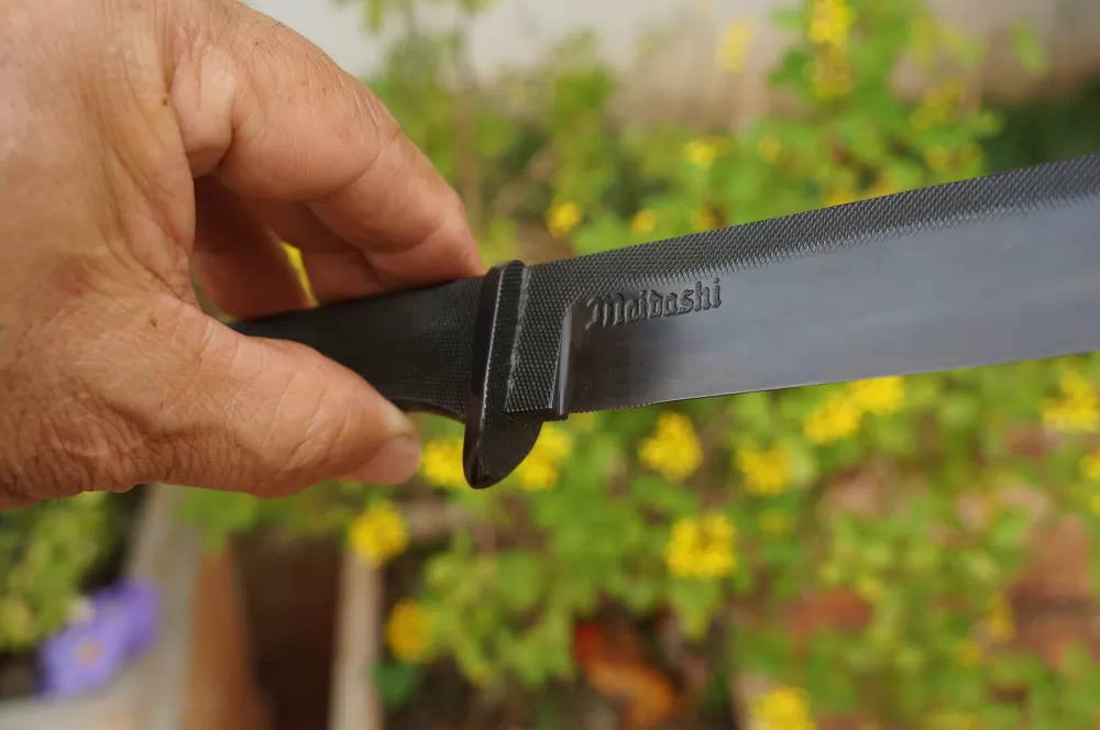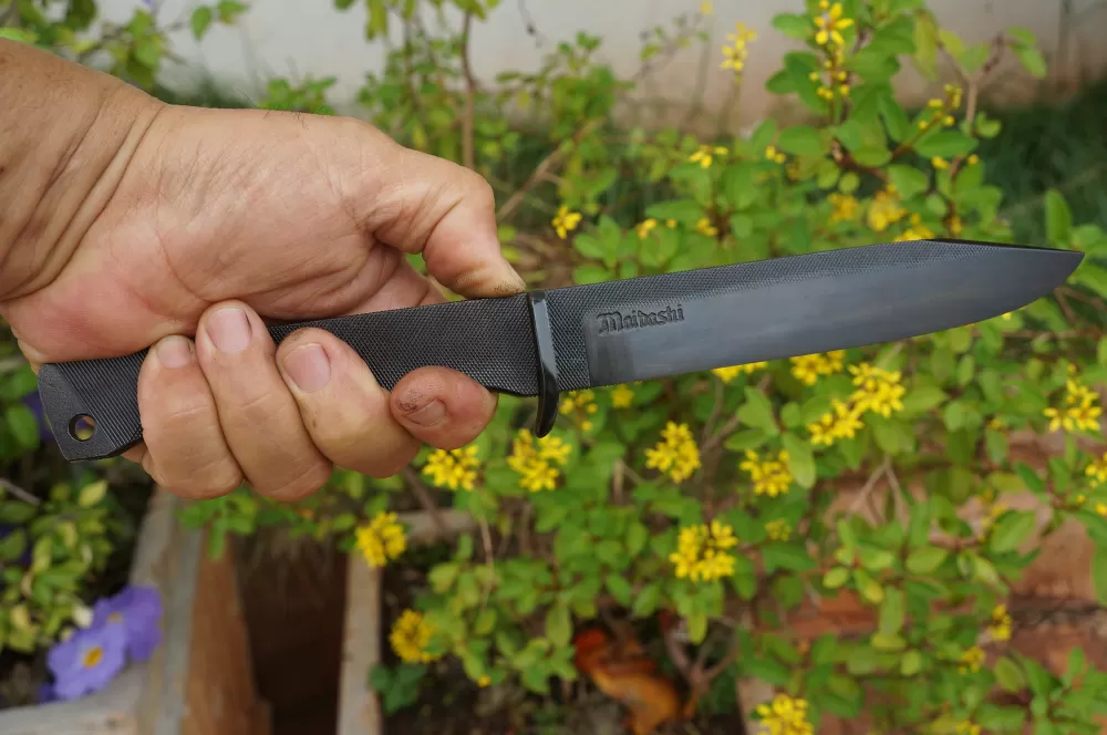 Dito isso, a Tática EDC Maibashi Knives foi confeccionada em Aço 1070, proveniente de uma Lima de 12 polegadas e de forma artesanal, em uma construção monobloco (full tang), com uma guarda no mesmo material fixada na peça por Brasagem.