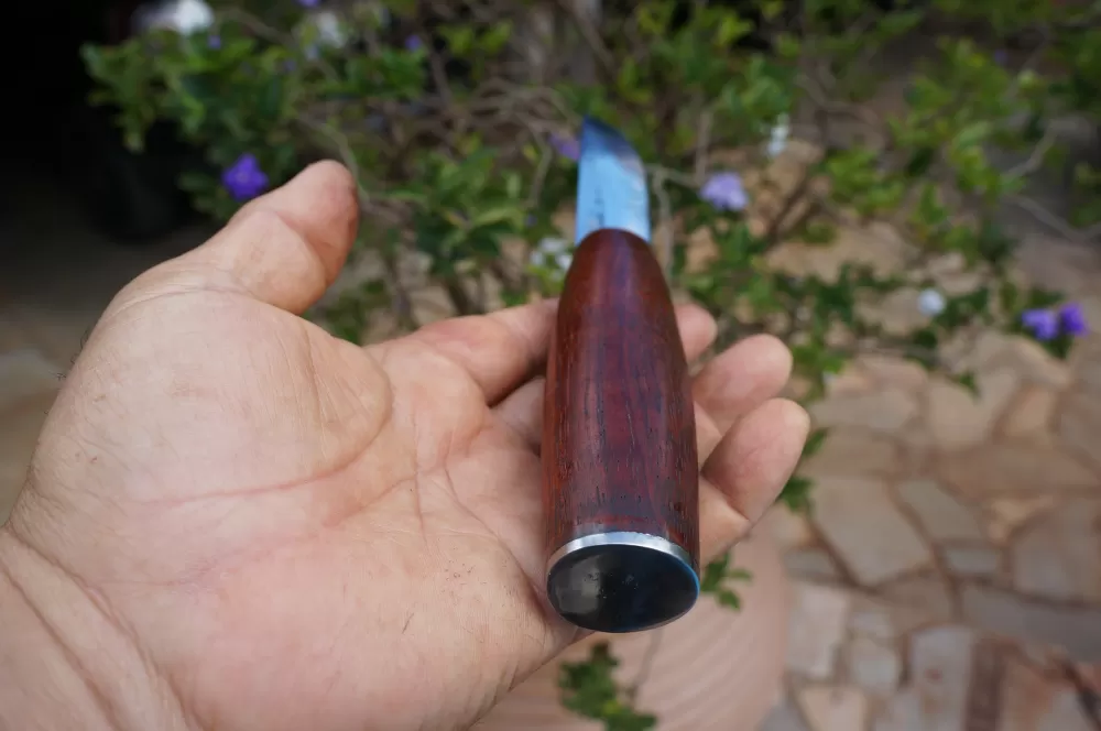 O acabamento do cabo pode apresentar nuances naturais e texturas únicas, tornando cada faca uma peça exclusiva.