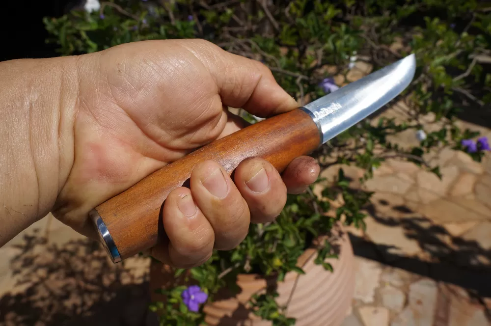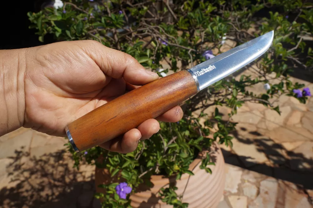 A simplicidade da Puukko é sua força, pois não possui elementos desnecessários. A empunhadura tradicional esculpida em madeira se encaixa perfeitamente na mão, possui acabamento em resina, e cabo em madeira, simples assim