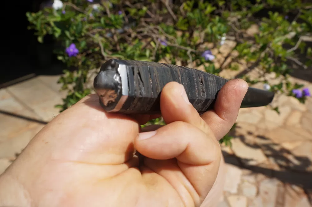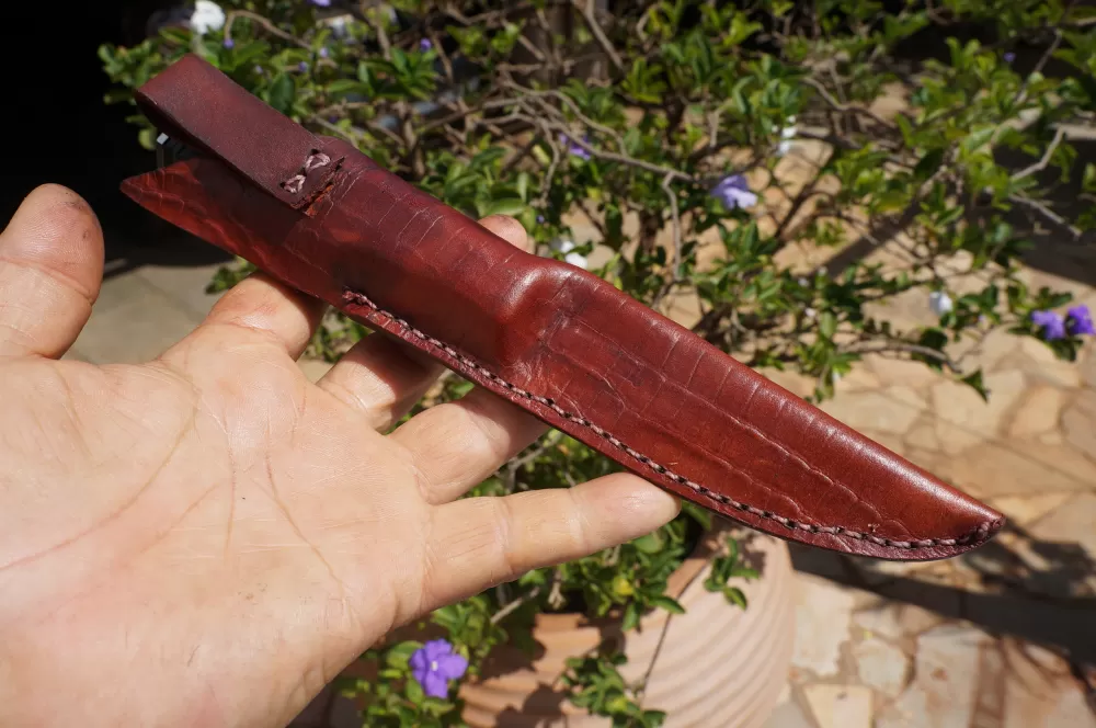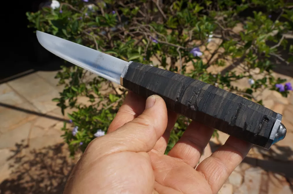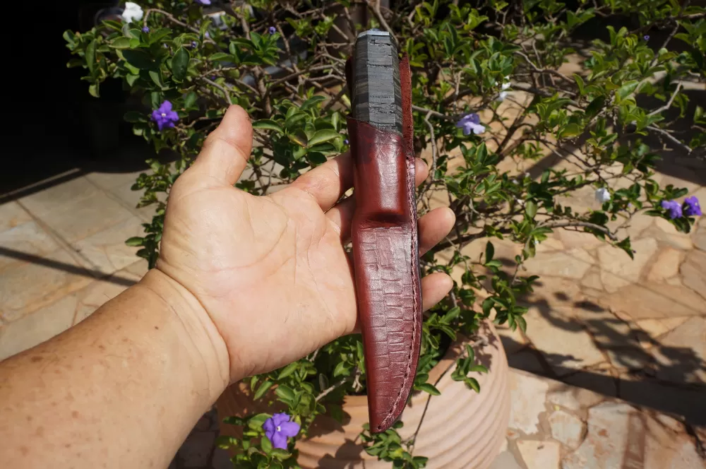 A simplicidade da Puukko é sua força, pois não possui elementos desnecessários. A empunhadura desta peça é um destaque à parte, totalmente em couro, o atanado Bovino (mais escuro) e o couro de cobra (mais claro), esculpido no formato Octogonal, se encaixa perfeitamente na mão, possui acabamento em aço Inox e um quebra cranio em um generoso "pingo" de solda bem atraente.