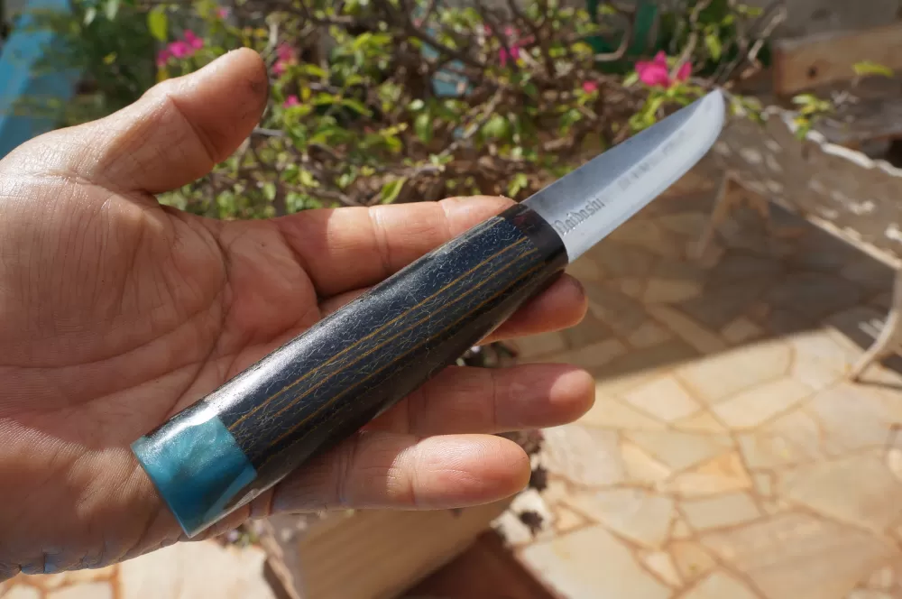 A simplicidade da Puukko é sua força, pois não possui elementos desnecessários. A empunhadura tradicional esculpida em Micarta de tecidos sintéticos, se encaixa perfeitamente na mão, com seus acabamentos em madeira em resina, conferiu a esta peça um peso adequado e bem balanceado, proporcionando um controle preciso e confortável.