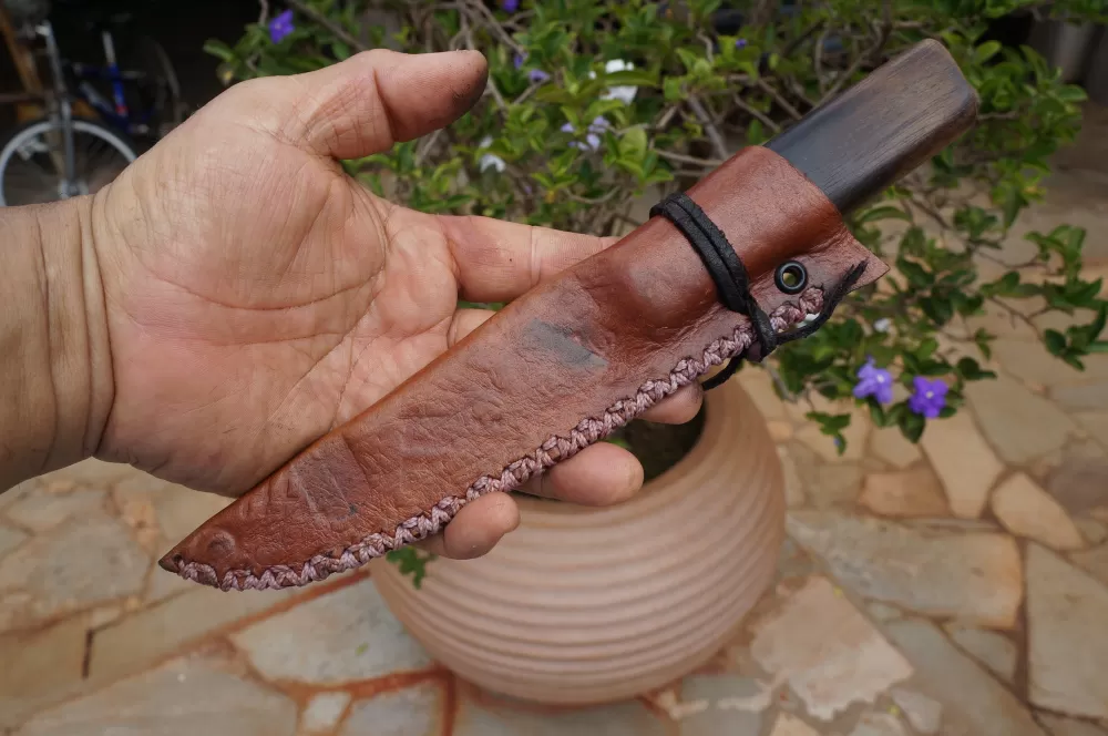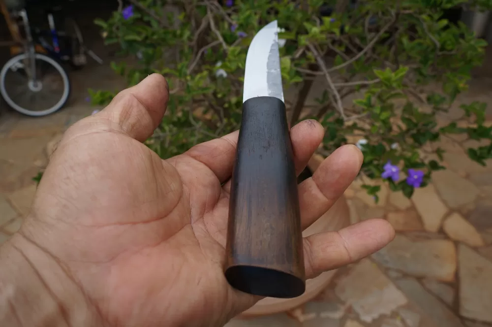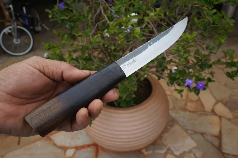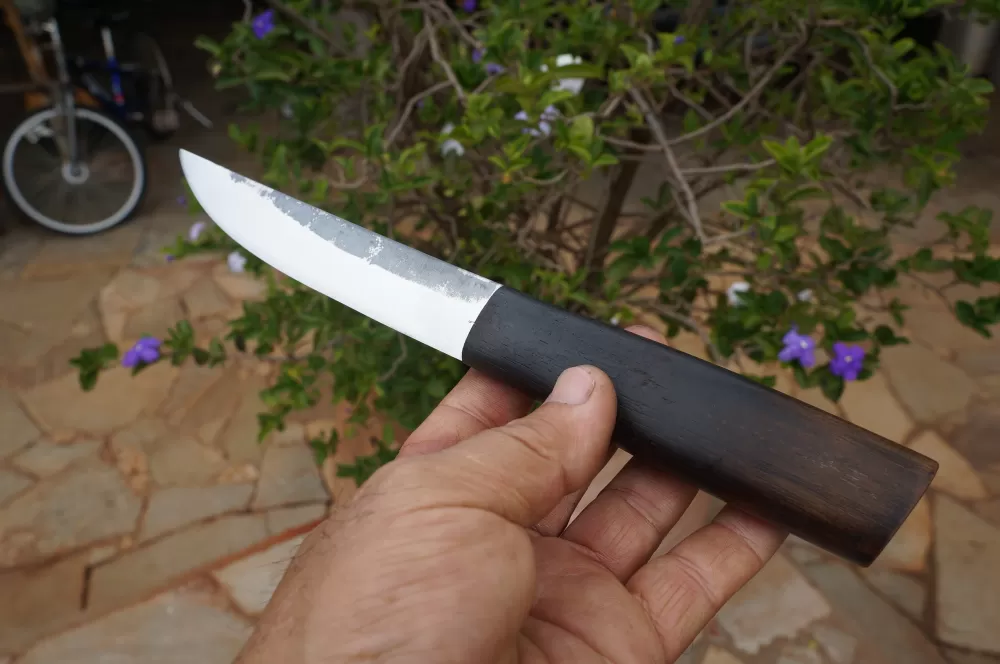 Seu design é elegante e atemporal, com uma lâmina curta e afiada, esta no caso, foi feita de aço de alta qualidade, o Carbono 1090 . Este aço de alto carbono, tem em sua principal caracteristica, possuir elevado poder de retenção de fio, proporcionando à faca um corte preciso e duradouro.