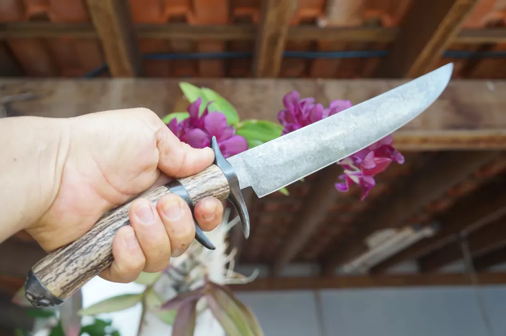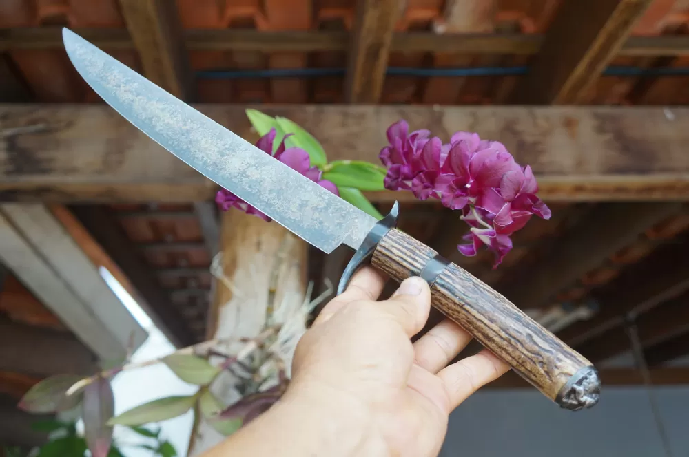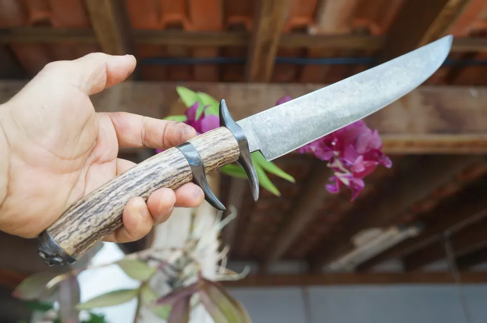 Faca Artesanal Churrasco 7016, confeccionada em aço carbono virgem 5160, construção hidden tang, com acabamento em aço 1070 com cabo em chifre de Cervo Natural.
