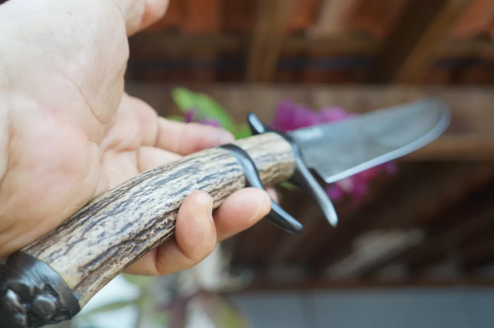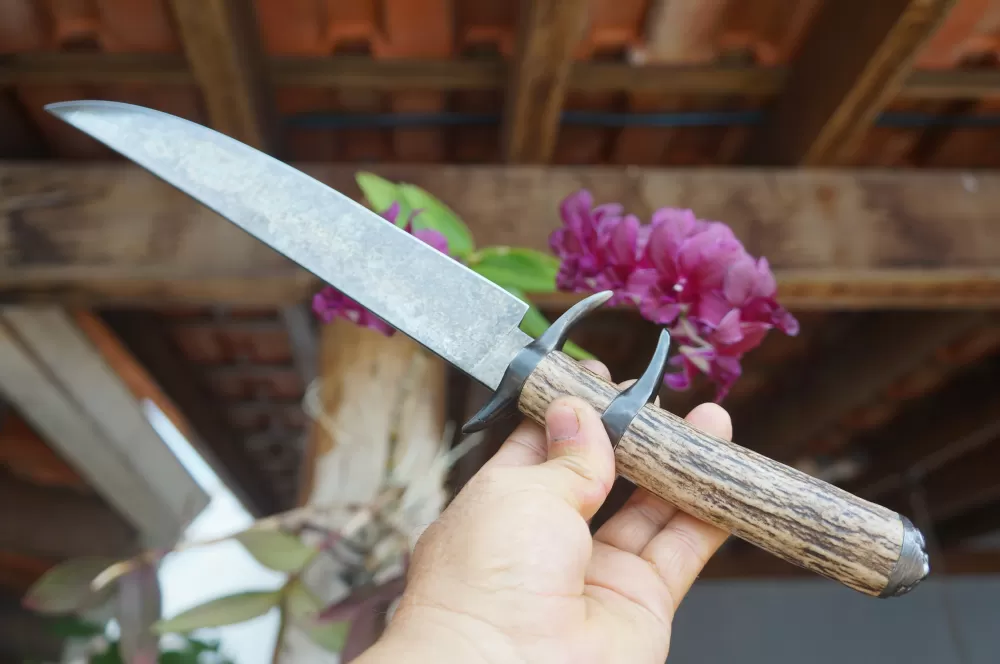 O cabo da faca é esculpido em um belo Chifre de Cervo com uma linda guarda dupla, robusta e funcional, confeccionada em aço 5160, com uma contra guarda na mesma anatomia e material, proporcionando ao conjunto beleza e harmonia.